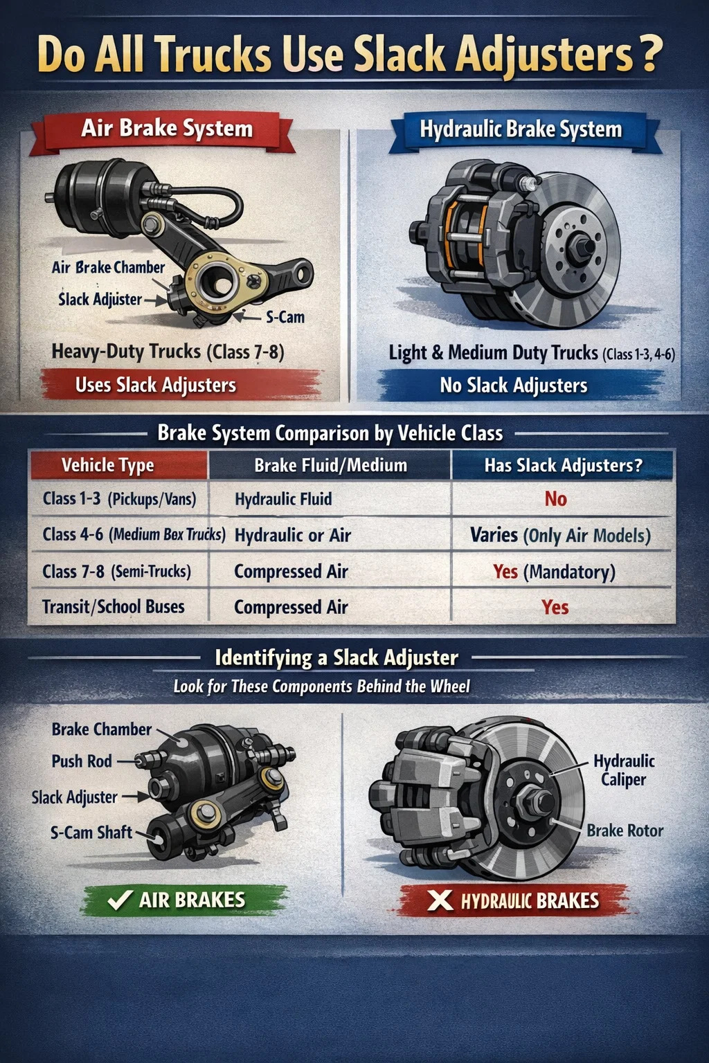 Co ciekawe, nawet nowoczesne pneumatyczne hamulce tarczowe (które stają się popularne w ciężarówkach klasy 8) mają wewnętrzny mechanizm realizujący funkcję „regulacji luzu”, ale brakuje im tradycyjnego zewnętrznego „ramienia”, do którego kierowcy są przyzwyczajeni i sprawdzani podczas kontroli CDL przed wyjazdem.