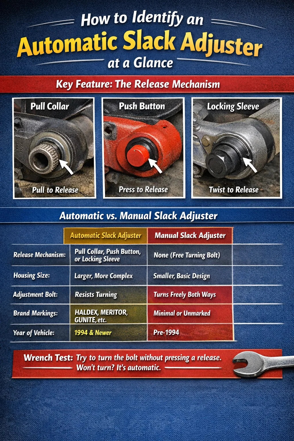 Tabliczka z numerem identyfikacyjnym pojazdu (VIN) znajdująca się na framudze drzwi lub na zewnątrz kabiny zawiera datę produkcji. Jeżeli pojazd został zbudowany po październiku 1994 r prawo federalne wymaga automatycznych regulatorów luzu. To znacznie zawęża identyfikację — jeśli jest to samochód ciężarowy wyprodukowany po 1994 r. i regulator nie ma oczywistego mechanizmu zwalniającego, coś zostało zmienione lub źle zamontowane i wymaga dalszego zbadania.