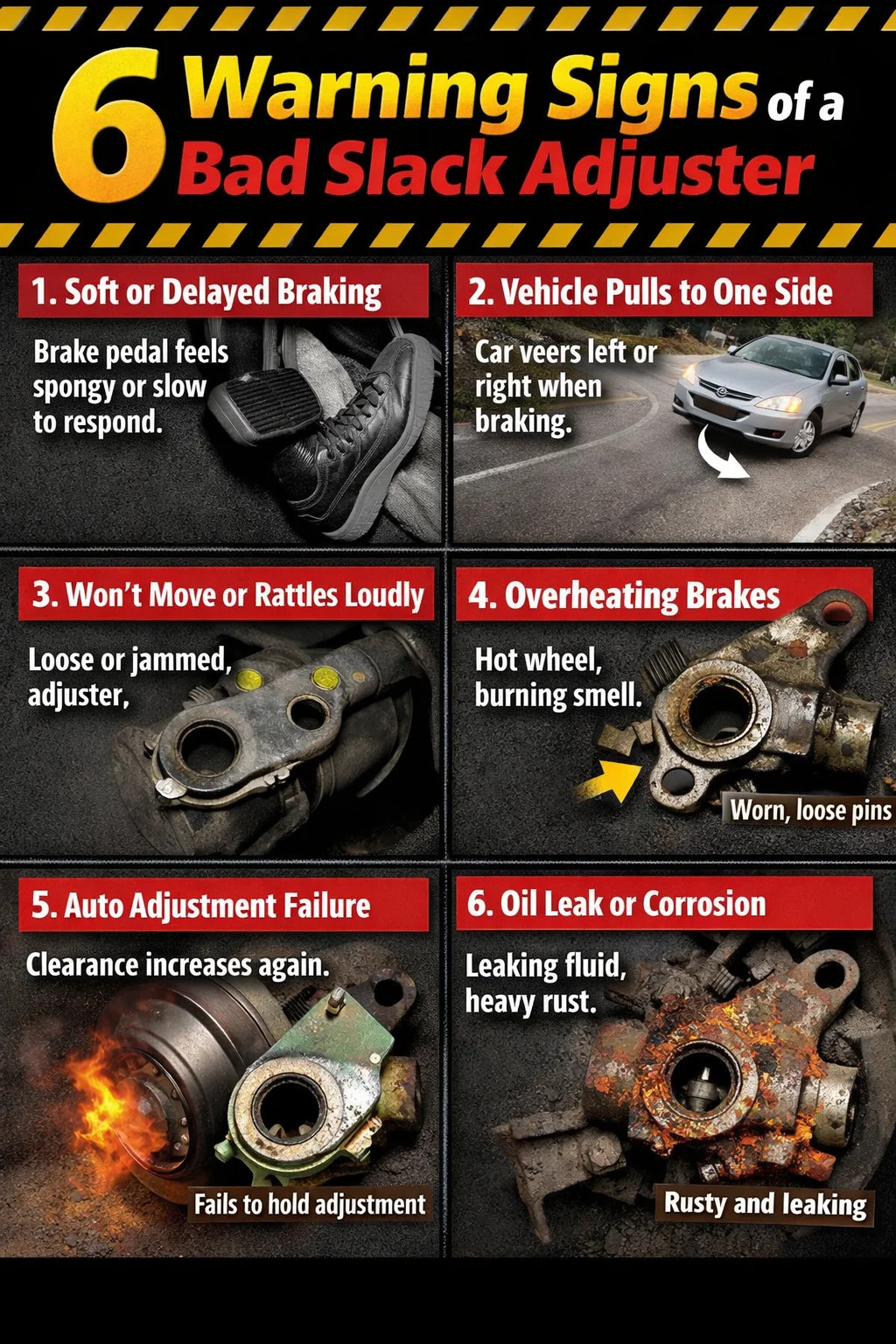Dzieje się tak zazwyczaj dlatego, że regulator luzu nie kompensuje skutecznie zużycia klocków hamulcowych, co skutkuje nadmiernym luzem. Popychacz komory powietrznej musi przebyć dużą odległość, zanim zadziałają hamulce.