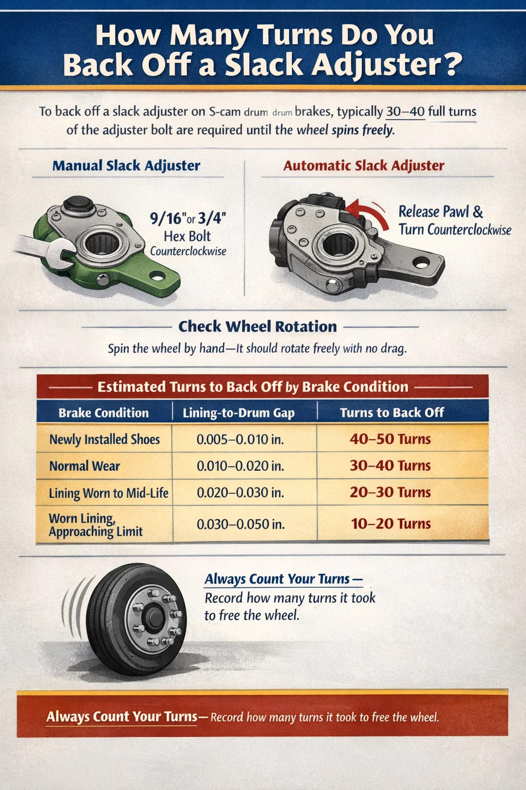 Koło powinno się swobodnie obracać ręcznie, bez słyszalnego lub wyczuwalnego oporu okładziny stykającej się z bębnem. W przypadku hamulców bębnowych typu S-cam można także włożyć szczelinomierz przez otwór kontrolny (jeśli jest obecny), aby sprawdzić minimalny luz 0,010 do 0,020 cala pomiędzy okładziną a bębnem.
