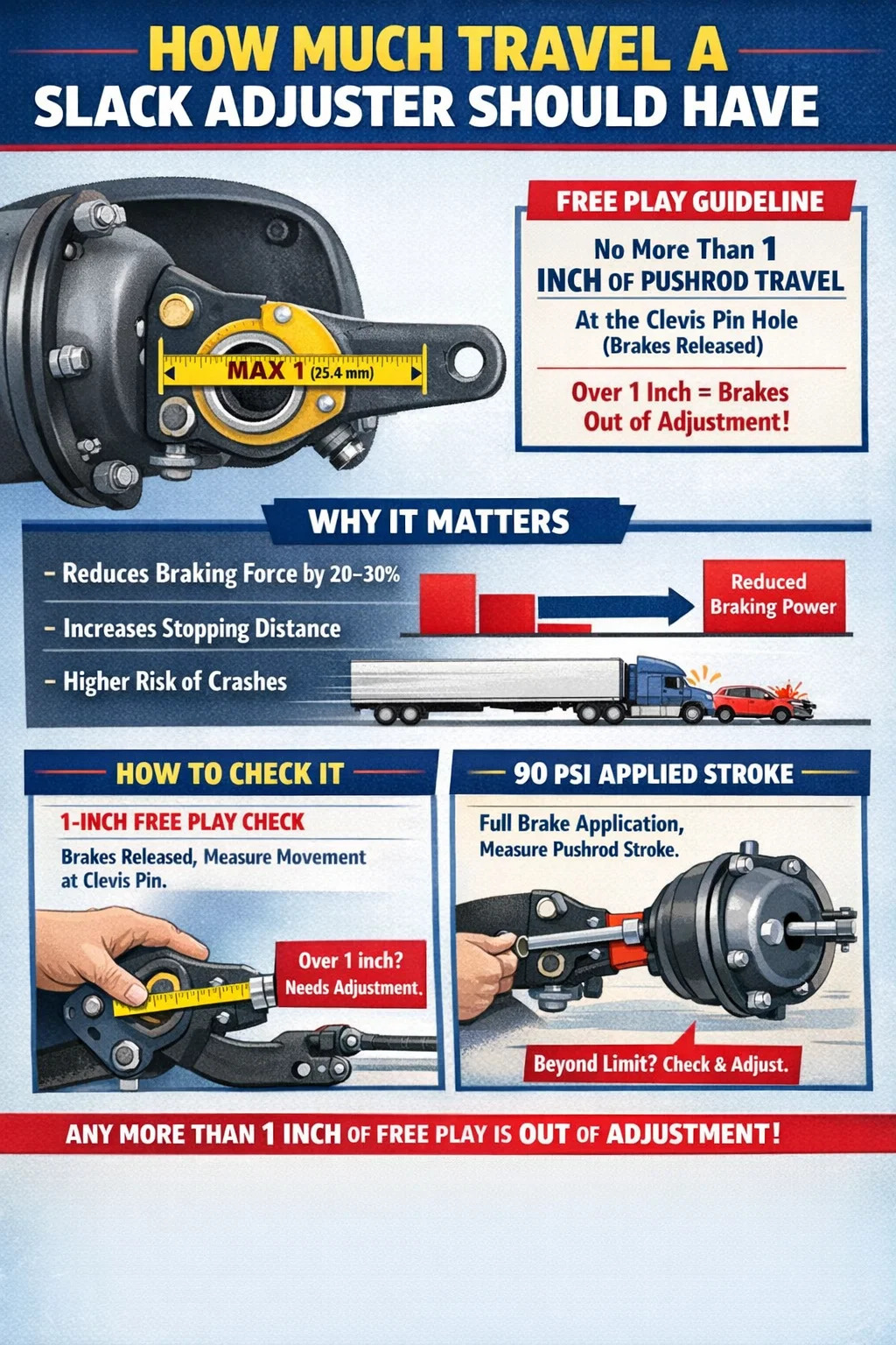 Jeśli skok popychacza przekracza dopuszczalny limit podczas uruchamiania hamulca, pojazd uznaje się za wycofany z eksploatacji. Dokładny limit zależy od rodzaju i wielkości komory hamulcowej, ale Powszechnie akceptowanym pomiarem pola jest 1 cal wolnego luzu na sworzniu widełkowym oznacza to właściwą regulację. Każdy regulator luzu wykazujący w tym punkcie skok większy niż 1 cal wymaga natychmiastowej uwagi.