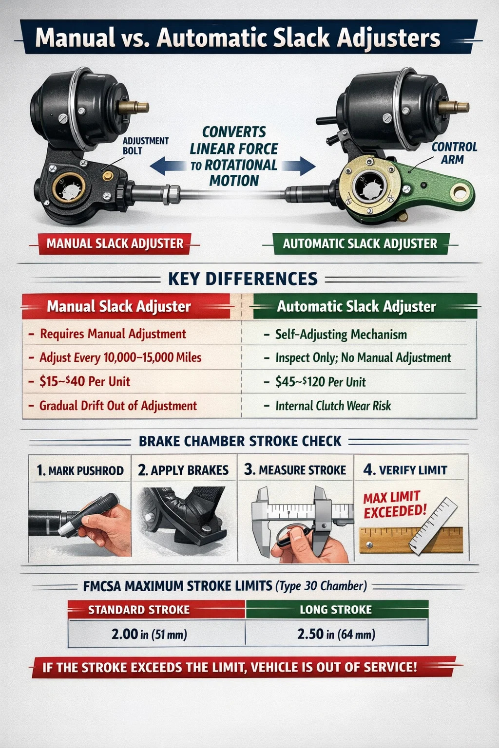 Z punktu widzenia operacji flotowych pojedyncze zamówienie na wycofanie z eksploatacji powoduje utratę przychodów, zatrzymanie kierowcy, koszty holowania, jeśli ma to zastosowanie, oraz ocenę w systemie SMS (Safety Measurement System) przewoźnika, która wpływa na ranking percentylowy CSA przez 24 miesiące. Koszt nieudanego przeglądu regulatora luzu rutynowo przekracza 2000 do 5000 dolarów, gdy obliczony zostanie całkowity wpływ operacyjny – znacznie więcej niż koszt samego regulatora luzu.