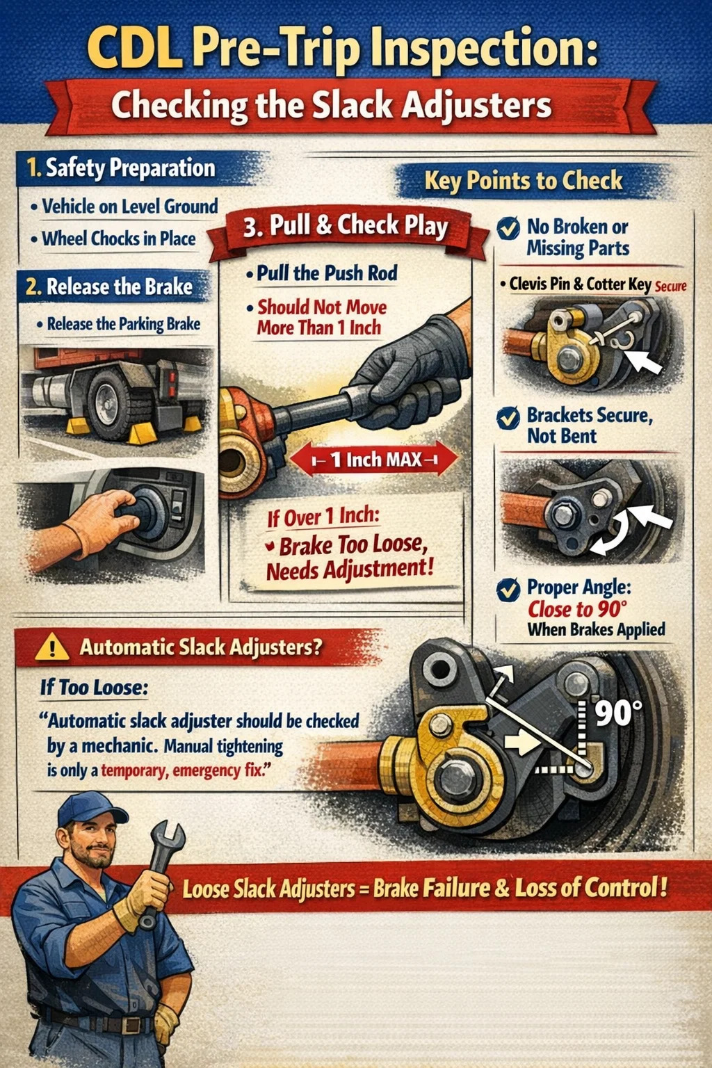 W procesie uzyskiwania zawodowego prawa jazdy (CDL) kontrola przed wyjazdem jest kluczową częścią, a kontrola regulatorów luzu jest jednym z punktów, na którym egzaminatorzy skupiają najwięcej uwagi.