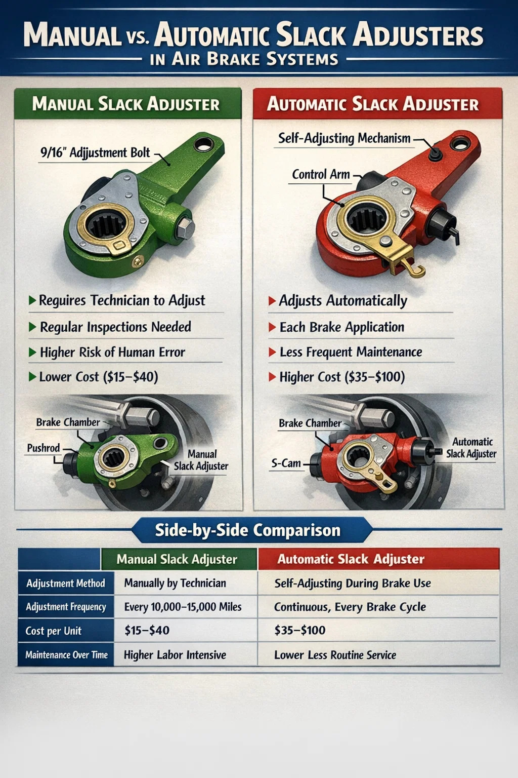 Zrozumienie obu typów pojazdów ma znaczenie niezależnie od tego, czy jesteś menedżerem floty, kierowcą zawodowym, technikiem hamulcowym czy osobą studiującą CDL. Przepisy federalne zgodnie z normą FMCSA 393.47 ustalają ścisłe ograniczenia dotyczące skoku popychacza, a niezaliczenie przeglądu z powodu niewyregulowanych hamulców może spowodować natychmiastowe uziemienie pojazdu. Wiedza o tym, jak działa każdy typ regulatora luzu i co może pójść nie tak w każdym z nich, gwarantuje, że pojazdy będą zgodne z przepisami, bezpieczne i pozostaną w ruchu.