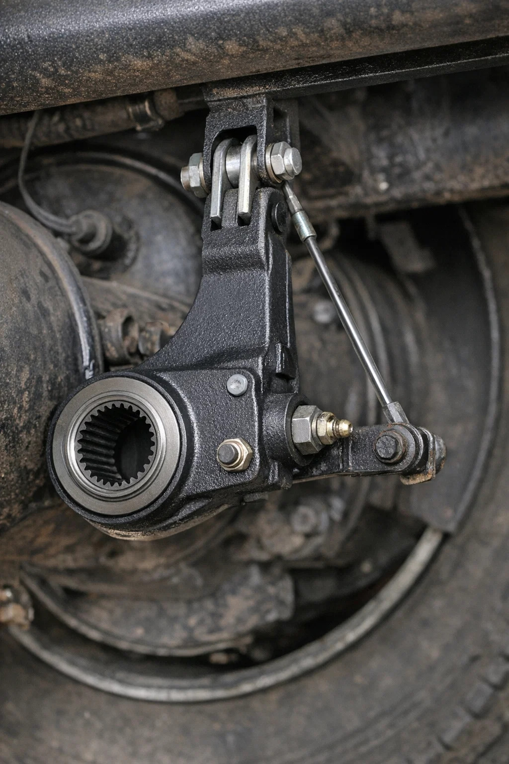The automatyczny regulator luzu jest jak „żelazne ramię” połączone z układem hamulcowym koła. Zwykle jest ukryty za osią po wewnętrznej stronie koła, ale jeśli zajrzysz pod pojazd, jest dość zauważalny.