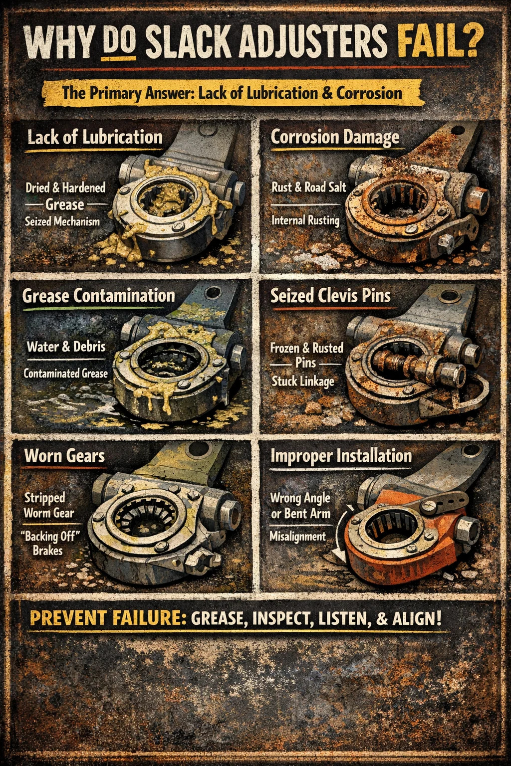 W zdecydowanej większości przypadków regulatory luzu zawodzą z powodu braku rutynowego smarowania i korozji środowiskowej. Ponieważ te elementy znajdują się na spodzie podwozia, są stale bombardowane przez gruz drogowy, wodę i żrące środki chemiczne do odladzania. Kiedy wewnętrzny smar wyschnie lub zostanie zanieczyszczony, delikatny wewnętrzny mechanizm zapadkowy zablokuje się lub zużyje, uniemożliwiając automatycznej regulacji luzu szczęk hamulcowych. Przyczynami wtórnymi są wewnętrzne zużycie mechaniczne kół zębatych i nieprawidłowy montaż wahacza.